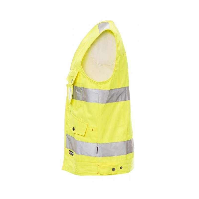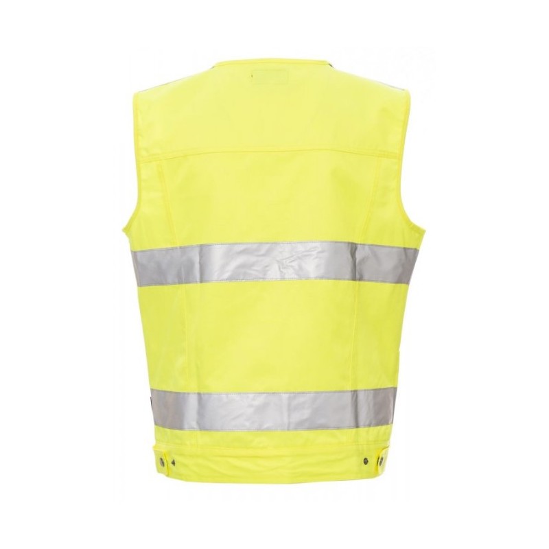 Gilet haute visibilité, coupe élancée modèle jeans, avec bandes 3M, full zip, deux poches kangourou devant avec rabat LOCK SYSTEM bouton en métal, deux poches sur la poitrine dont une LOCK SYSTEM, porte-badge détachable et refermable. Porte-smartphone