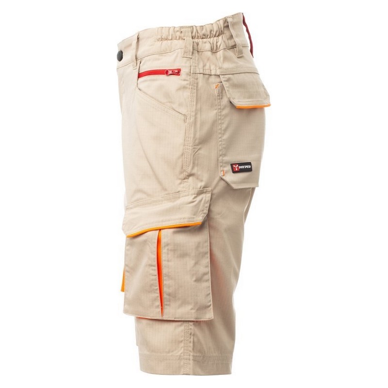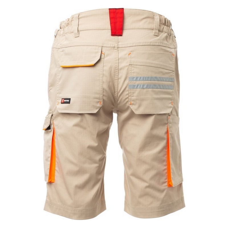 Short Next 400 unisexe, stretch, avec élastiques latéraux et passants à la taille, fermeture à zip et bouton personnalisé. Multipoches avec détails en contraste. Porte badge, porte mètre, porte-smartphone, porte-monnaie et poche de sécurité avec zip. Baguettes de renfort en contraste à différents endroits. Coutures à trois aiguilles sur l’entrejambe, l’intérieur et l’extérieur jambe. es tailles (italiennes) centrales 48-50-52 ont un intérieur jambe de 31 cm.