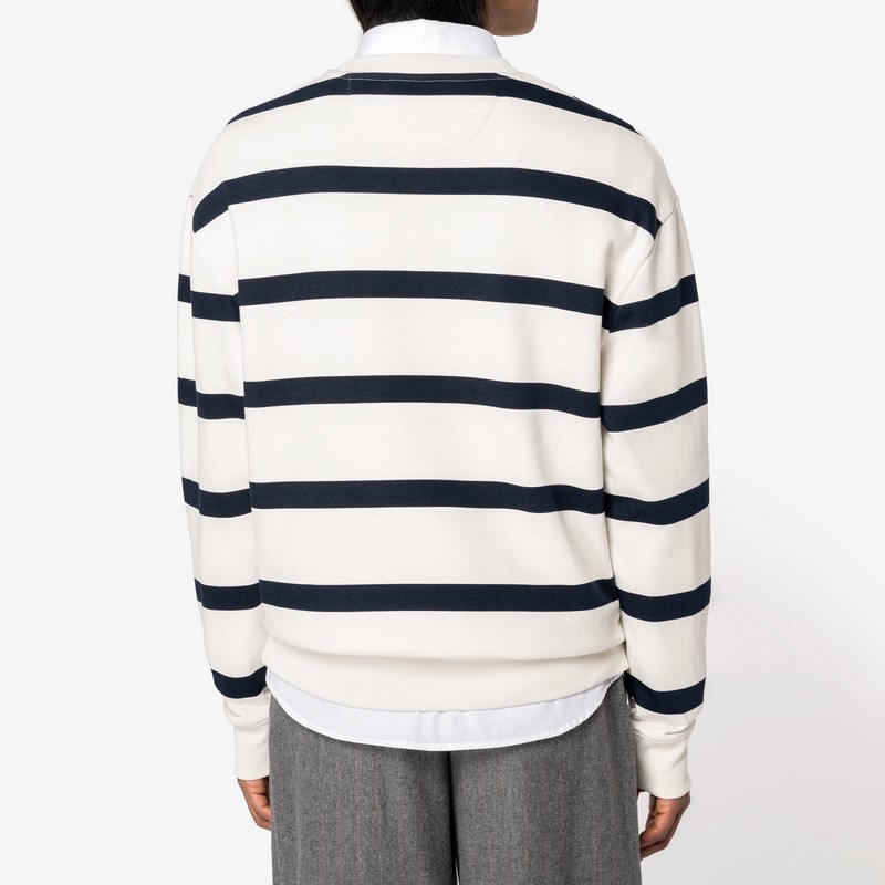 Sweat shirt écoresponsable à col rond à rayures et épaules tombantes unisexe. Coton peigné. Rayures marines imprimées sur toute la surface. Lavé aux enzymes. Bord côte 1 x 1 au col, bas de manches et bas de vêtement. Finition intérieur col avec bande de propreté en jersey ton sur ton. Demi-lune au dos. Coupe standard à épaules tombantes.