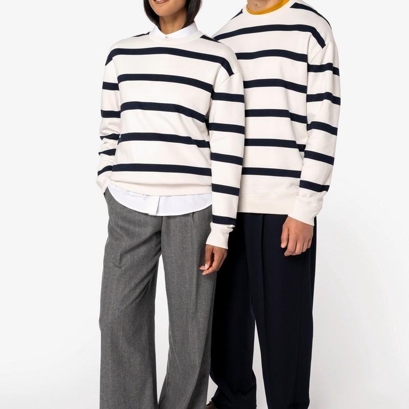 Sweat shirt écoresponsable unisexe à col rond, avec des rayures marines et des épaules tombantes, offrant un style moderne. Sa surface lisse permet une personnalisation optimale, sans étiquette, ce qui le rend entièrement adaptable à vos besoins. Ce modèle de sweat shirt à rayures est personnalisable avec votre logo, que ce soit par broderie ou sérigraphie.